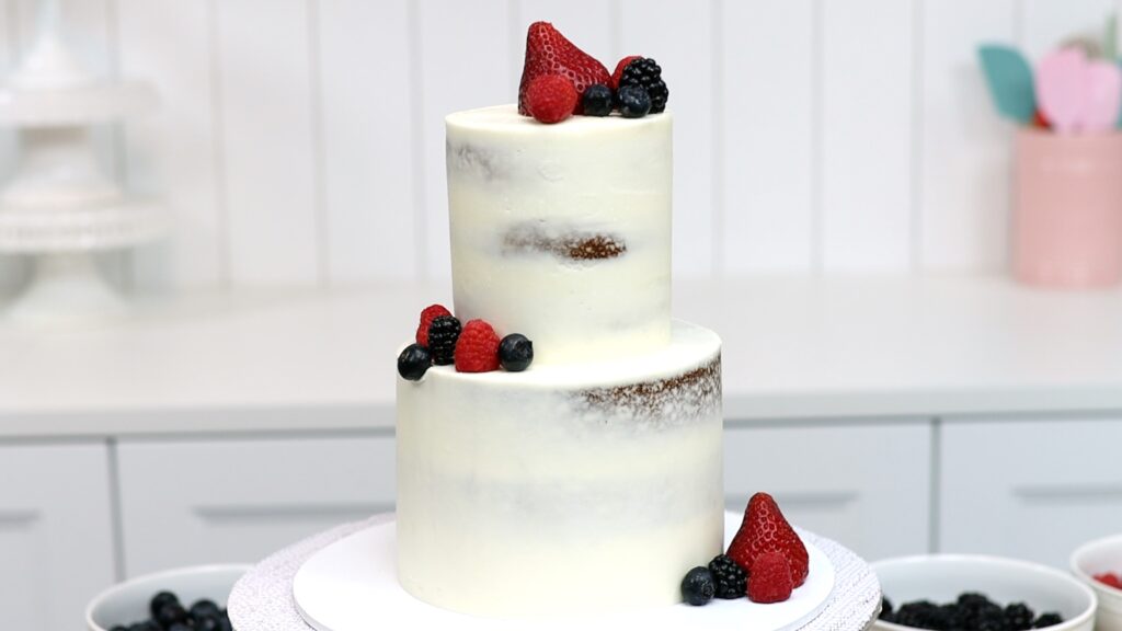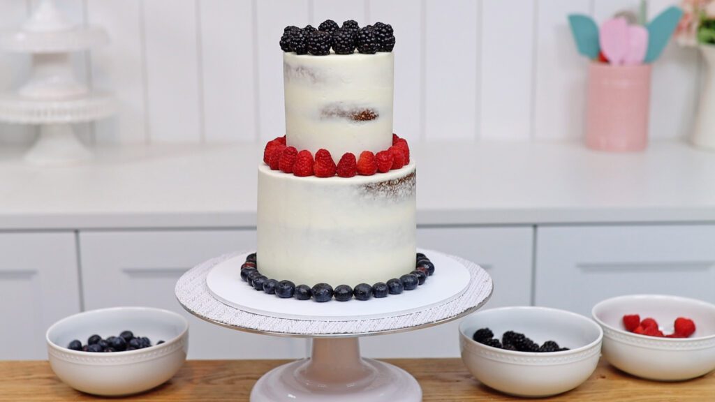 There are lots of ways to decorate a cake fresh berries. If you don’t smooth the top edge of the frosting you’ll leave a wall around the cake. This will hold a pile of berries in place.