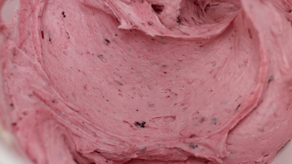 This is my 4 Minute Buttercream mixed with cooked berries. Add the cooked berries instead of the milk in the recipe to give the frosting amazing colour and flavour without making it too runny. I think the flecks of berry make it look delicious, too!