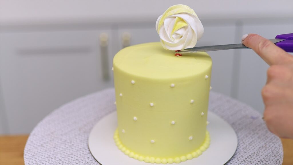 This works on the top of the cake but also on the sides! When the frosting dot sets it will keep the meringue securely in place. Isn't this cake gorgeous? Visit my cake school for online courses on hundreds of cake designs and techniques and sign up for my free course in the menu at the top of this bar!