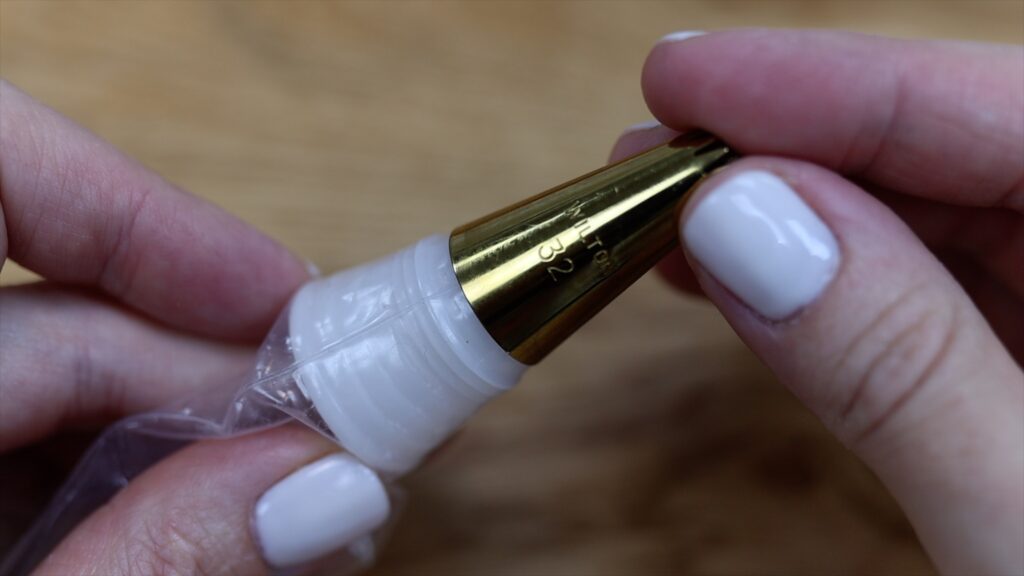 Couplers are a much quicker and easier method to use the same colour of meringue with different piping tips. You can switch between colours effortlessly and you won’t have nearly as much to clean up at the end! Drop a coupler into a piping bag and place a piping tip on it on the outside of the bag. Then screw the coupler ring on to hold the piping tip in place.