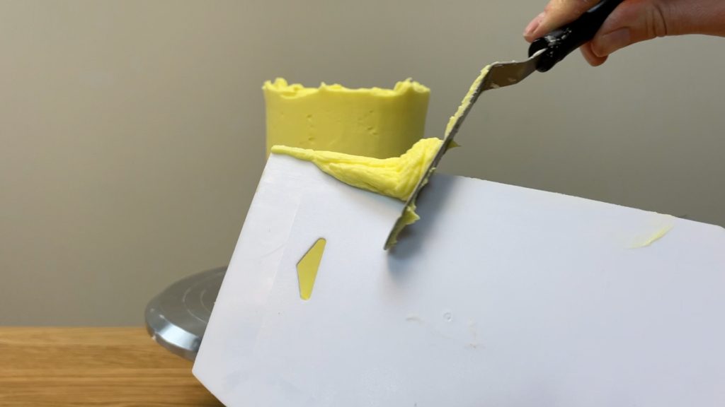 Remember to always press the base of the frosting smoother down onto the cake board so that the edge of the frosting smoother is upright.