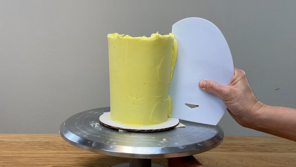When the cake is covered with frosting, switch to a frosting smoother of any material – plastic, metal, or acrylic. I’ll show you the difference in a moment.