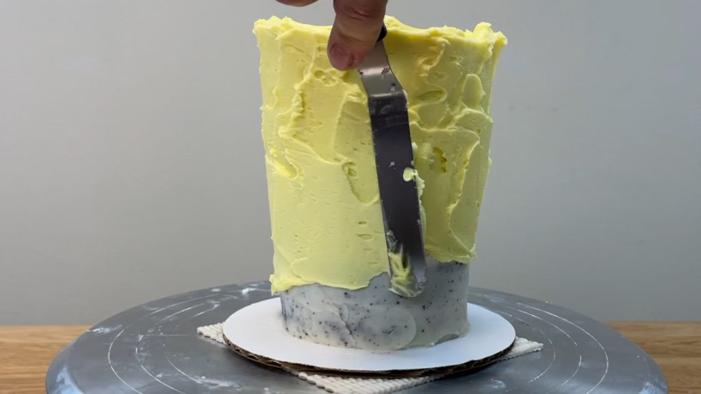 Spread the buttercream all the way down to the very bottom of the cake, right down to the cake board, so there’s no cake exposed anywhere. The point of this layer of frosting, called a crumb coat, is to trap any crumbs that come off the cake so that they don’t get into the final coat of frosting. It doesn’t need to be pretty, so the crumbs you can see stuck in this frosting are absolutely fine.