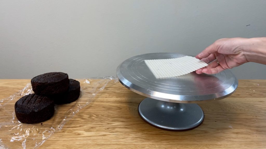 Now that your cake layers are chilled, it’s time to build your cake! Take them out of the fridge or freezer and unwrap them. If you have a
