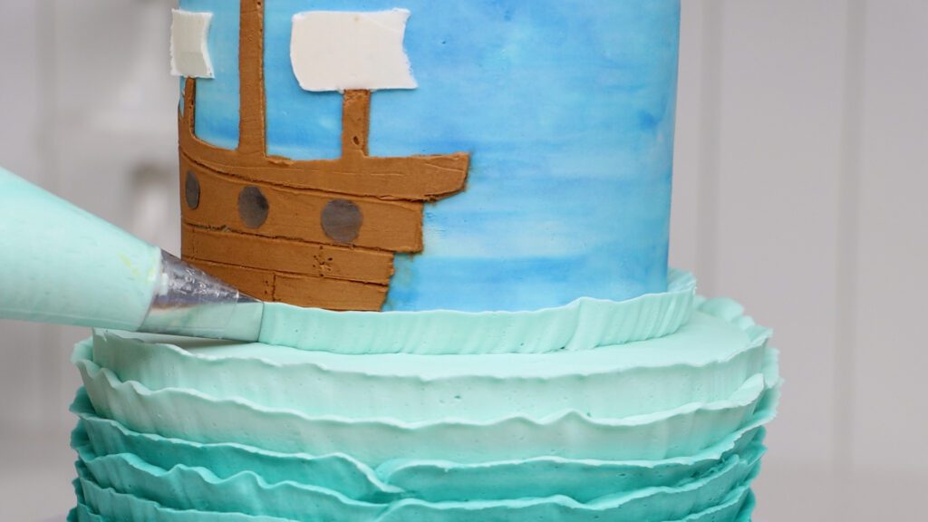 Put this same colour into a piping bag with a petal piping tip. Pipe a ruffle around the top of the cake so that it sticks up above the tope edge. If you don't have a petal piping tip you can just spread this colour straight onto the cake. You'll get all of the beautiful ocean colours, just without the texture.